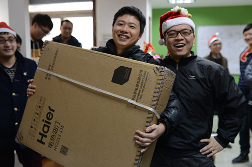 Mintcode在Christmas Eve有个传统的节目——“交换礼物”及公司抽奖。幸运的Jessica一共拿了三个奖品,还有Jerry,Bell分别抽到了一等(魔声耳机)、二等(小米3手机)奖……可喜可贺 除此,还有游戏——密室大逃生,发挥大家的判断能力,团结精神了~~~